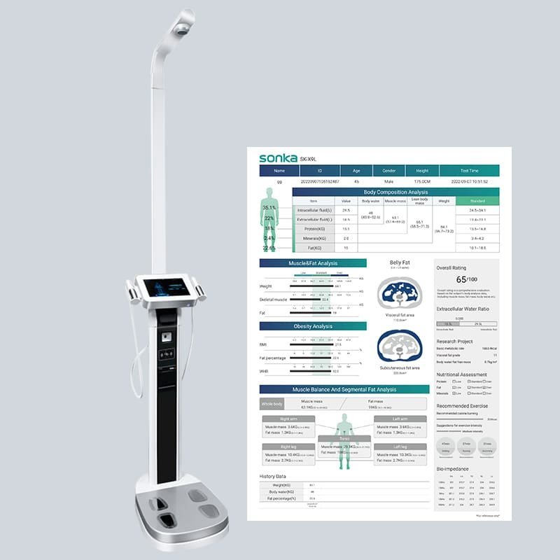 • Ūgio ir svorio automatinis kūno sudėties analizatorius su 8 varžos elektrodais, kelių dažnių kūno analizatoriumi.