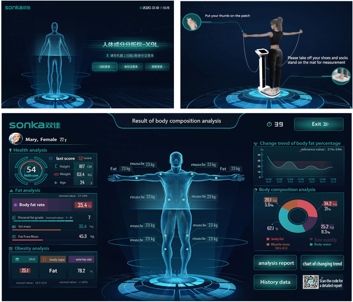 Kūno sudėties analizatorius gali būti naudojamas sveikatos centruose, ligoninėse, sporto salėse, grožio salonuose, prekybos centruose ir kt. Neriebalinė masė, skeleto raumenų, kūno riebalų masė, kūno skysčiai, visceralinių riebalų klasė, segmentinė riebalų masė, bazinė medžiagų apykaita, juosmens ir klubų santykis, segmentinė raumenų masė ir kt. funkcijos leidžia išmatuoti sausą liesą kūno masę, liesą kūno masę ir kūno riebalų masę. Jos nustatomos pagal vandens kiekį, esantį kūno ląstelėse ir už jų ribų. Taip pat galima sekti su raumenimis ir kūno riebalais susijusią riziką ir užkirsti kelią nutukimui.