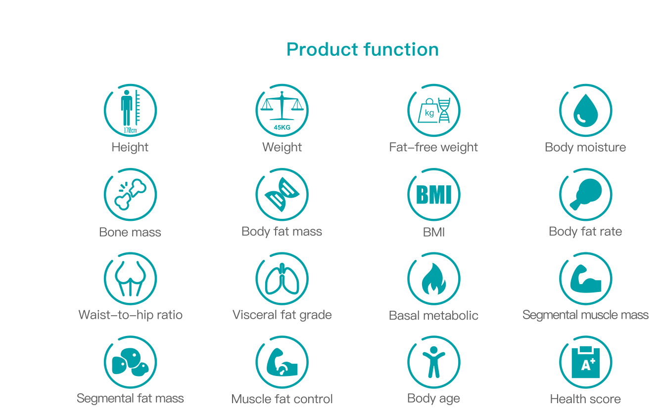 • Pagrindinės funkcijos: Ūgis, Svoris, Svoris be riebalų, Kūno skysčiai, Skeleto raumenys, Kūno riebalų masė, KMI, Juosmens ir klubų santykis, Visceralinių riebalų klasė, Bazinė medžiagų apykaita, Segmentinė raumenų masė, Segmentinė riebalų masė, Raumenų riebalų kontrolė, Biologinis amžius, Sveikatos balas.