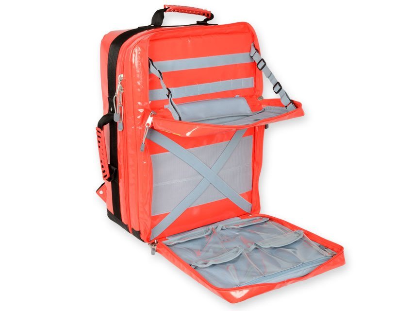 - dvi išorinės kišenės su elastinėmis juostelėmis ir lipniomis juostelėmis: viena 35×16 cm, kita 35×32 cm su 4 vidinėmis permatomomis kišenėmis
