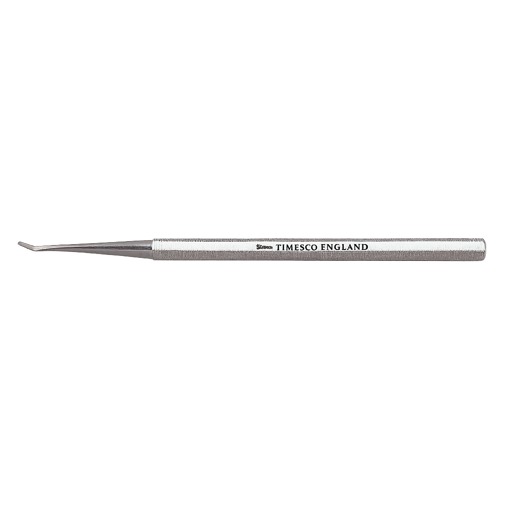- Aukštos kokybės profesionalus nagų zondas su ergonomiškai išlenktu kotu („swan neck“) ir itin tiksliu smailiu plokščiu antgaliu.