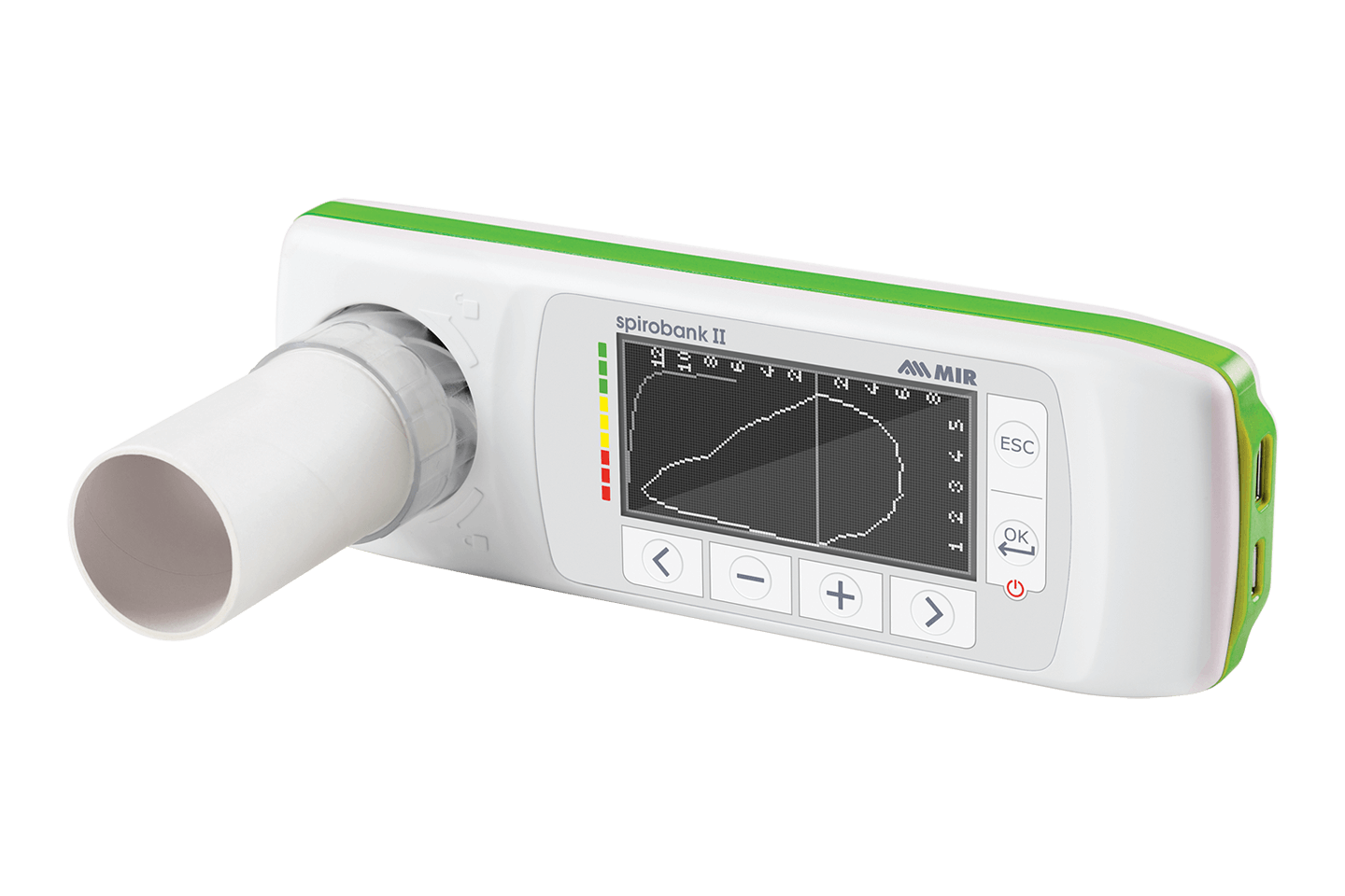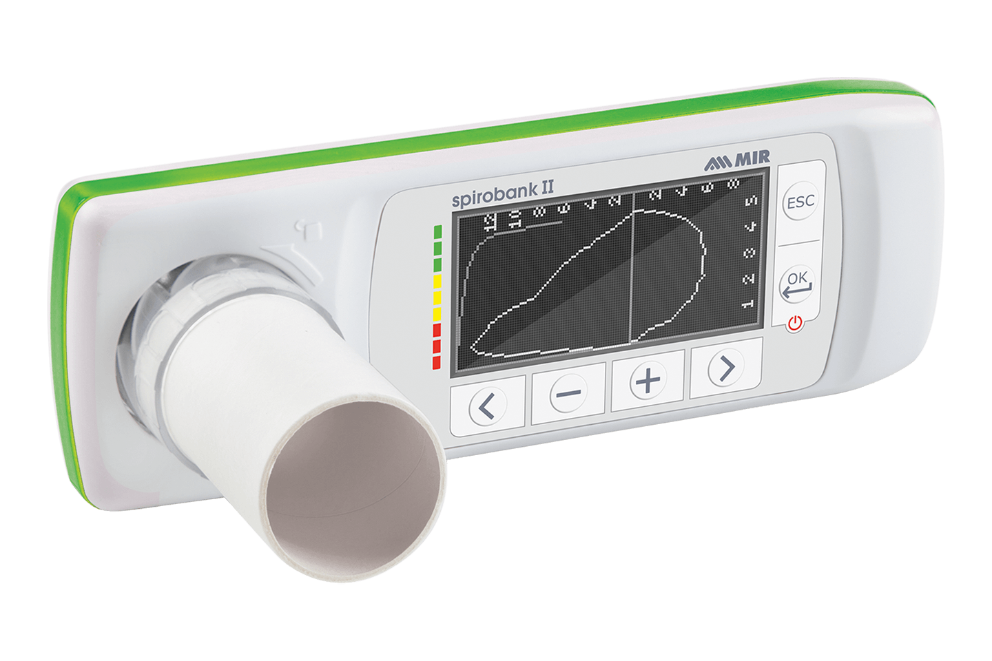 - Spirometras leidžia realiuoju laiku rodyti spirometrinius tyrimus prietaiso ekrane ir kompiuteryje naudojant „MIR Spiro“ programinę įrangą.