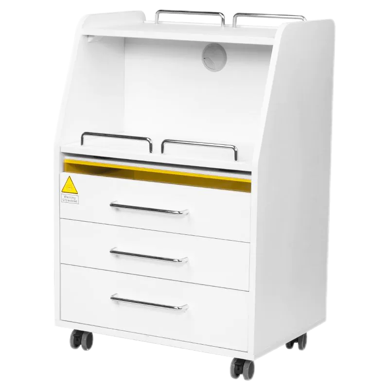 • Turi stalčius įrankiams, priedams ir išstumiamą lentyną podiatrijos frezai ar kitam įrenginiui.