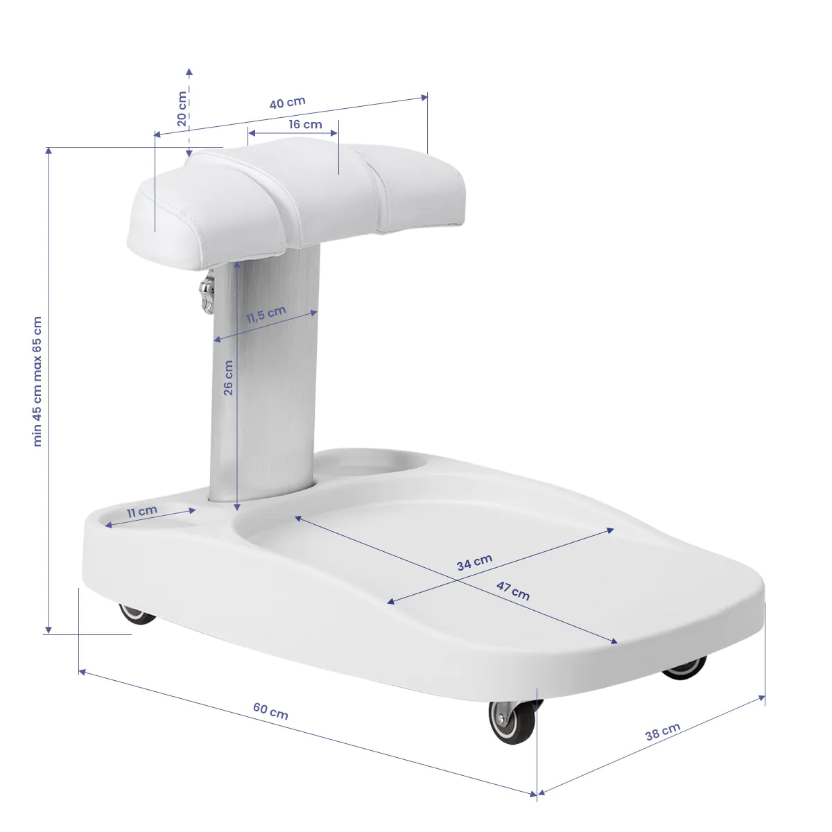 - Dėl to vežimėlį galima pritaikyti prie individualių naudotojo poreikių, todėl jis yra puikus sprendimas tiek kosmetinėms, tiek podiatrinėms procedūroms, užtikrinantis komfortą ir darbo tikslumą įvairiose padėtyse.