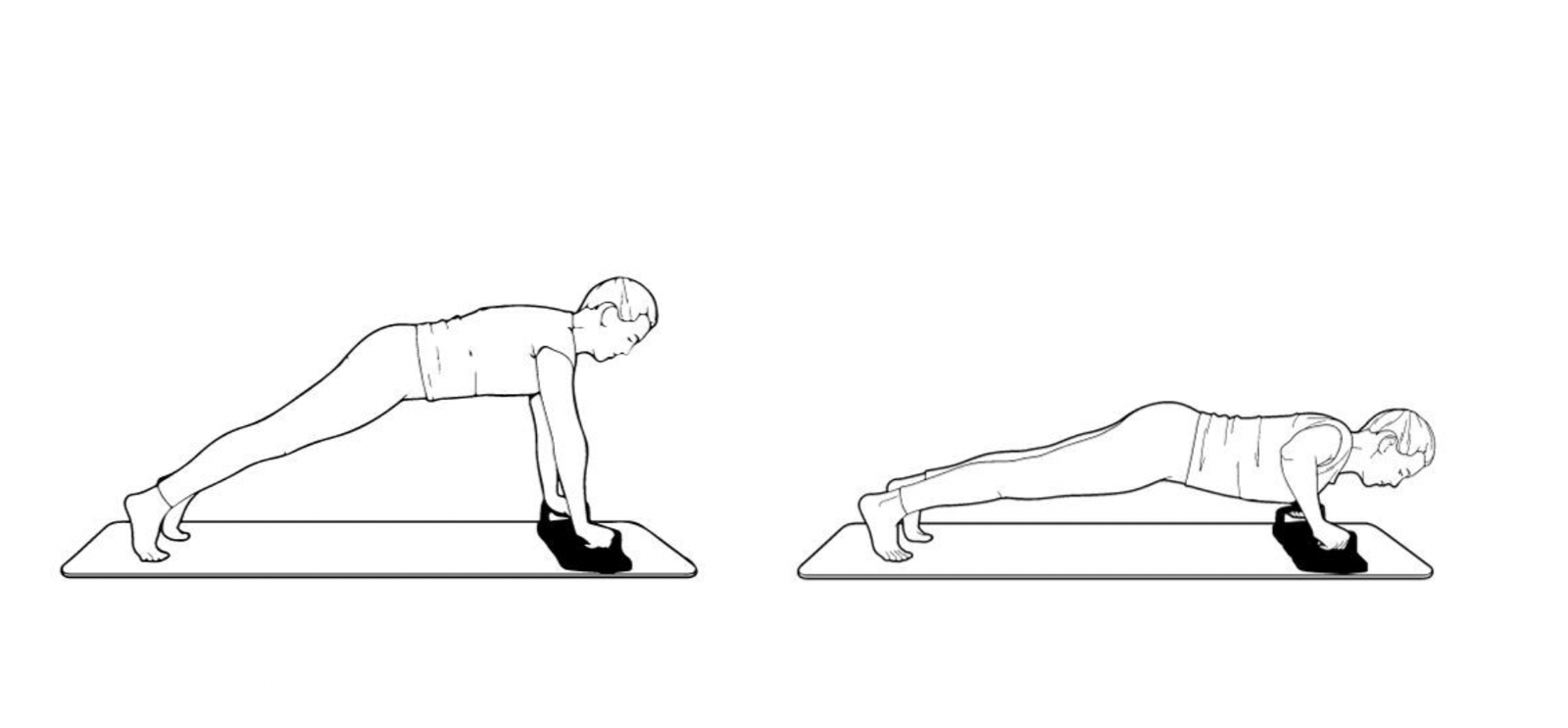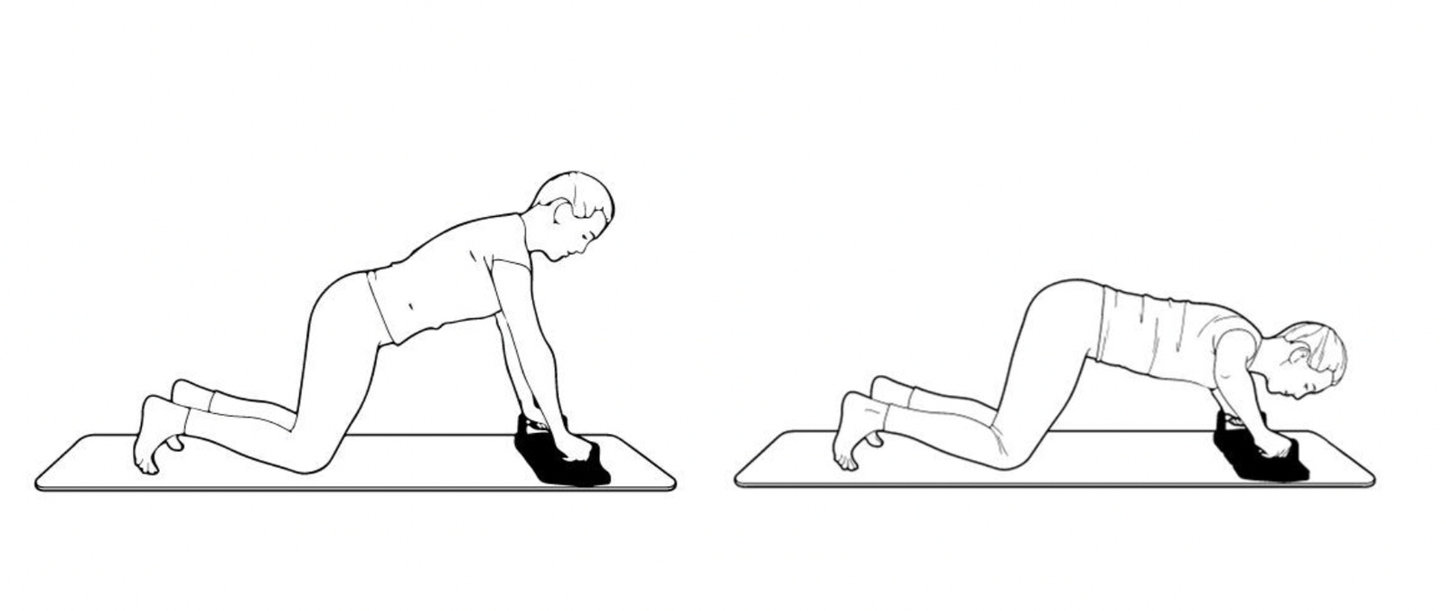 Uždėkite rankas ant rankenų ir tada pastatykite kūną į atraminę padėtį (veidu žemyn). Jūsų kūnas turi sudaryti tiesią liniją nuo galvos iki kulnų. Palaipsniui sulenkite rankas ir nuleiskite kūną kuo žemiau, išlaikydami vertikalią kūno liniją. Grįžkite į pradinę padėtį, stumdami kūną aukštyn.