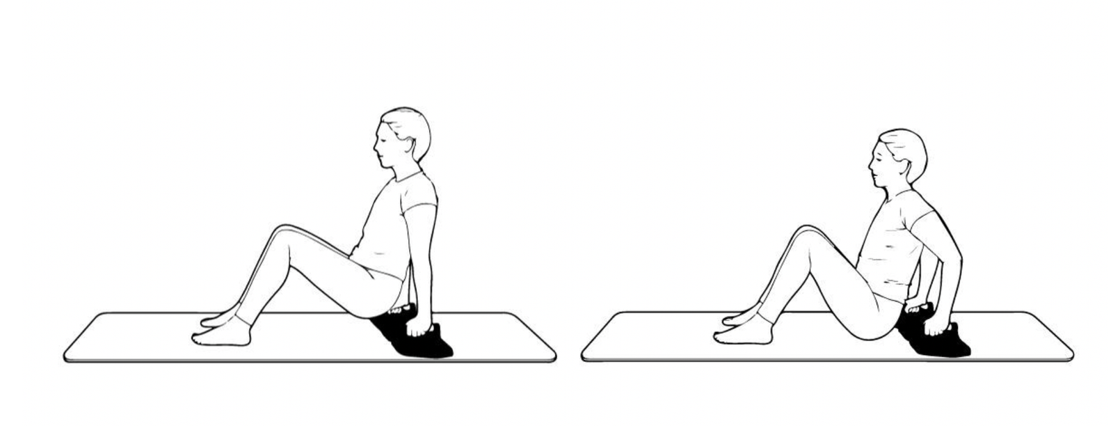 Atsisėskite nugara prie lentos ir uždėkite rankas ant rankenų. Pratimą pradėkite tiesiomis rankomis, švelniai nuleisdami kūną žemyn – tada rankų jėga pakelkite kūną atgal į pradinę padėtį.