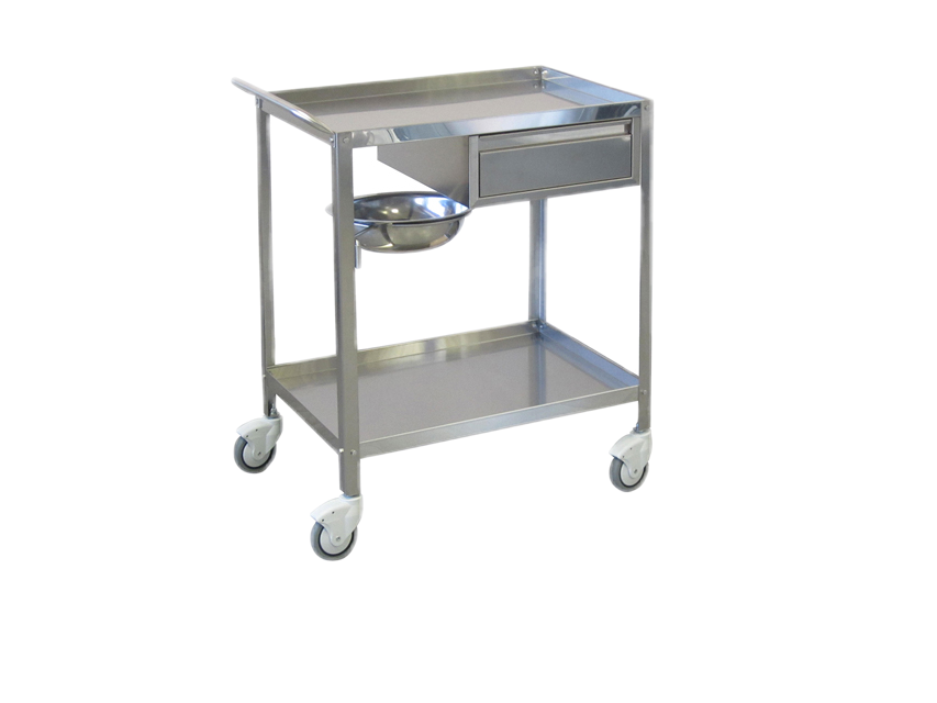 • Priežiūros vežimėlis pagamintas iš AISI 304 nerūdijančio plieno su 2 lentynomis (70×50 cm), 1 stalčiumi (35x46xh 12 cm), praustuvo laikikliu ir praustuvu (Ø 32xh 9 cm).