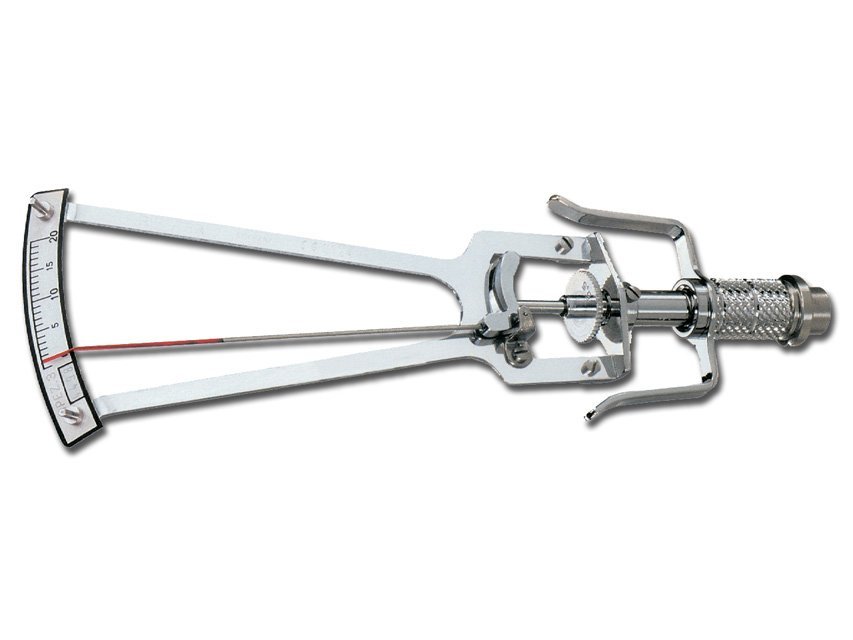 - Klasikinis Schiotz tonometras su pasvirusia skale, skirtas akispūdžiui (intraokuliniam spaudimui) matuoti įdubimo (indentacijos) principu.