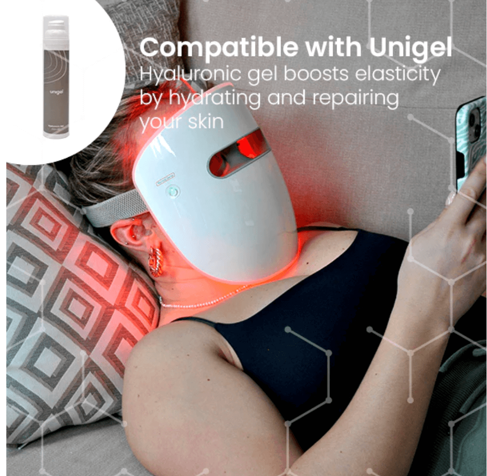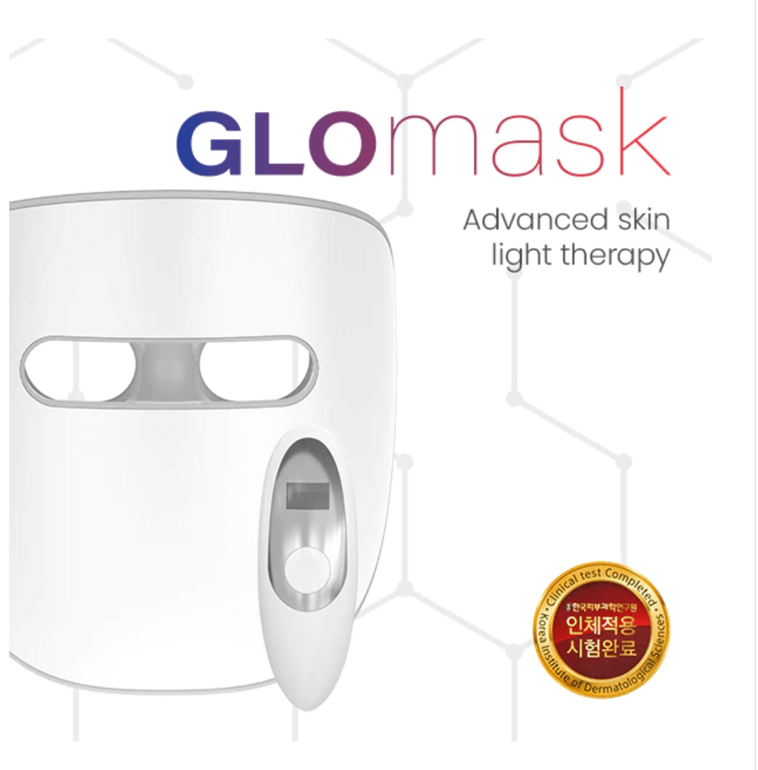 RAUDONA ŠVIESA IR INFRARAUDONIEJI SPINDULIAI: „Glomask” turi specialiai pritaikytą raudonos šviesos ir infraraudonųjų spindulių technologiją, kuri padeda: pagerinti kolageno gamybą ir odos elastingumą, mažina raukšles, mažina veido randus ir saulės nudegimų padarytą žalą bei pagerina odos spindesį. Suteikia odai atjaunėjusią ir jaunatvišką išvaizdą.