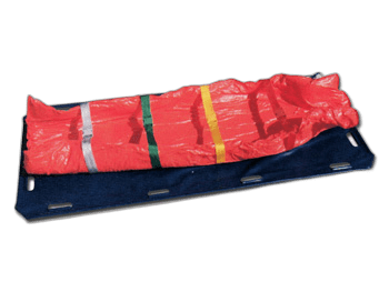 PVC, rentgeno spindulius permatantis čiužinys su 4 imobilizacijos diržais ir 12 transportavimo angų.