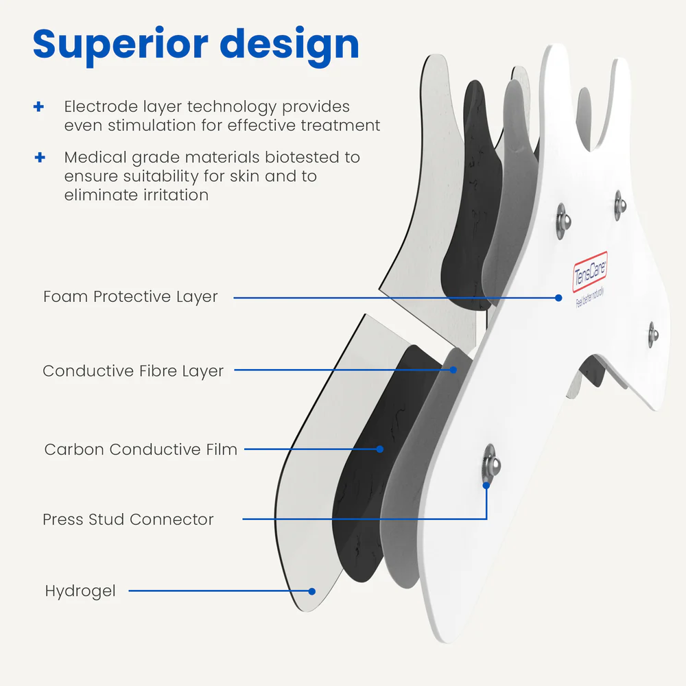 • Pažangi elektrodų sluoksnių technologija – Daugiasluoksnė konstrukcija užtikrina puikų laidumą ir veiksmingą stimuliaciją, įskaitant gelio apsauginį sluoksnį, laidų pluoštų sluoksnį, anglies laidžią plėvelę ir saugią spaustukinę jungtį.