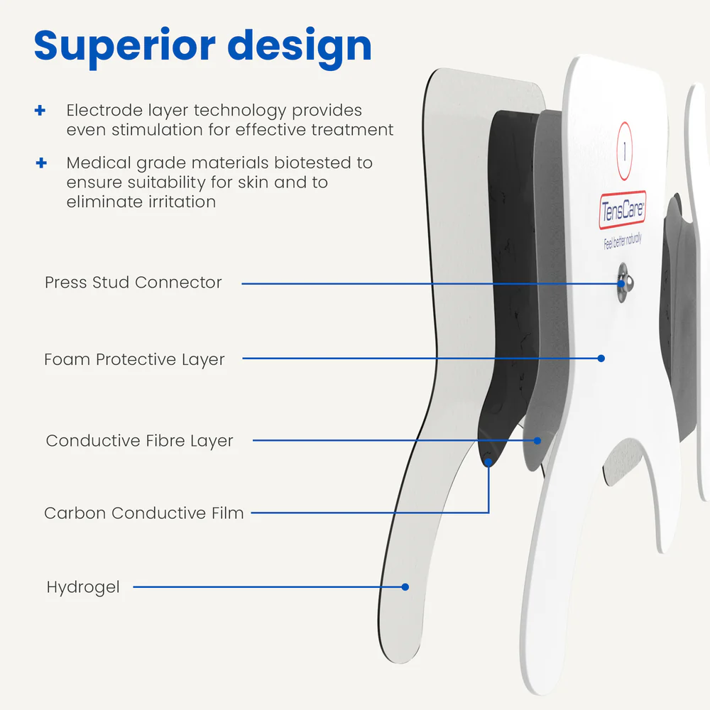 • Pažangi elektrodų sluoksnių technologija – daugiasluoksnė konstrukcija, užtikrinanti geresnį laidumą ir efektyvią stimuliaciją, įskaitant apsauginį gelio sluoksnį, laidaus pluošto sluoksnį, anglies laidžiąją plėvelę ir saugią prispaudimo jungtį.